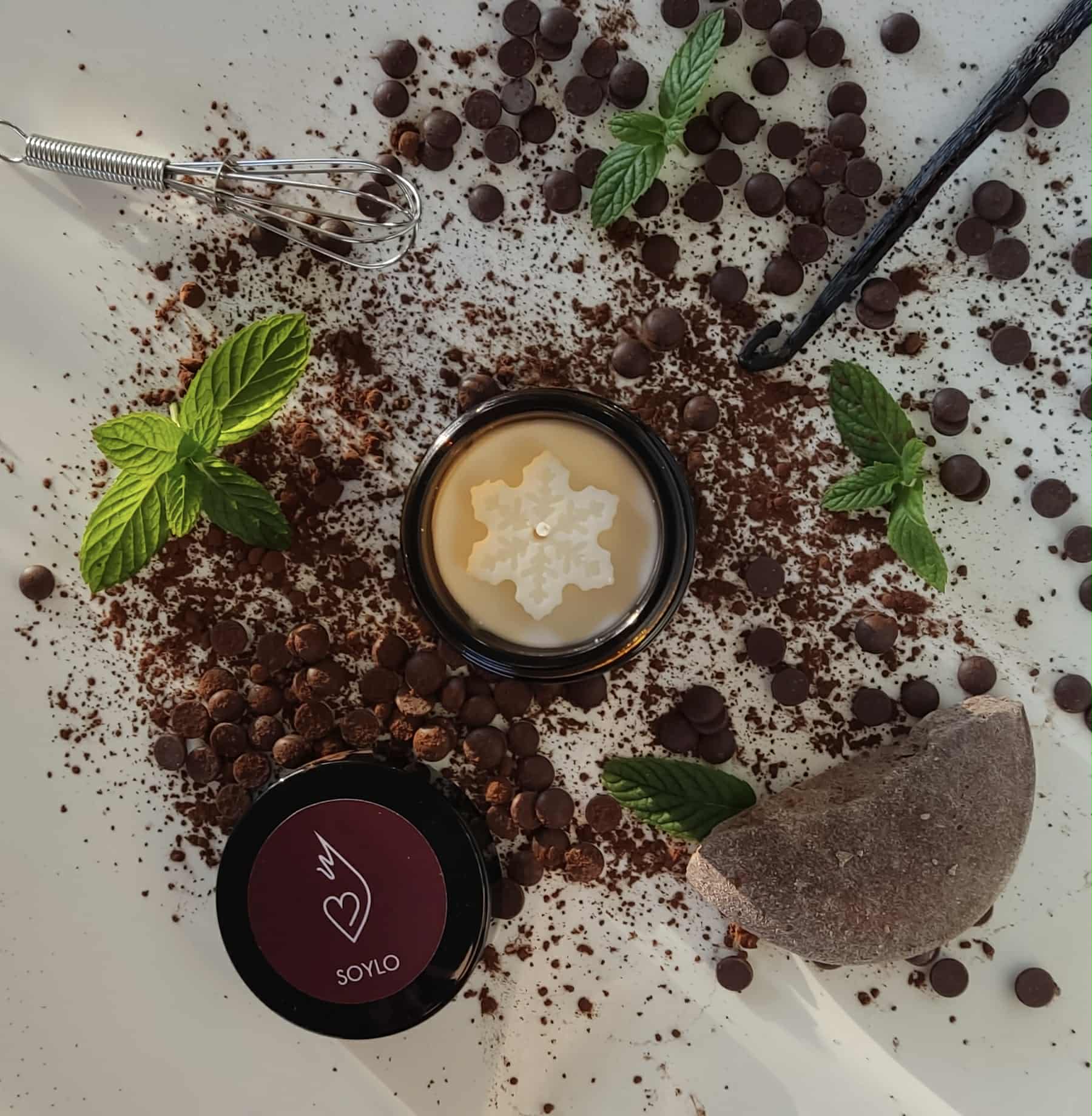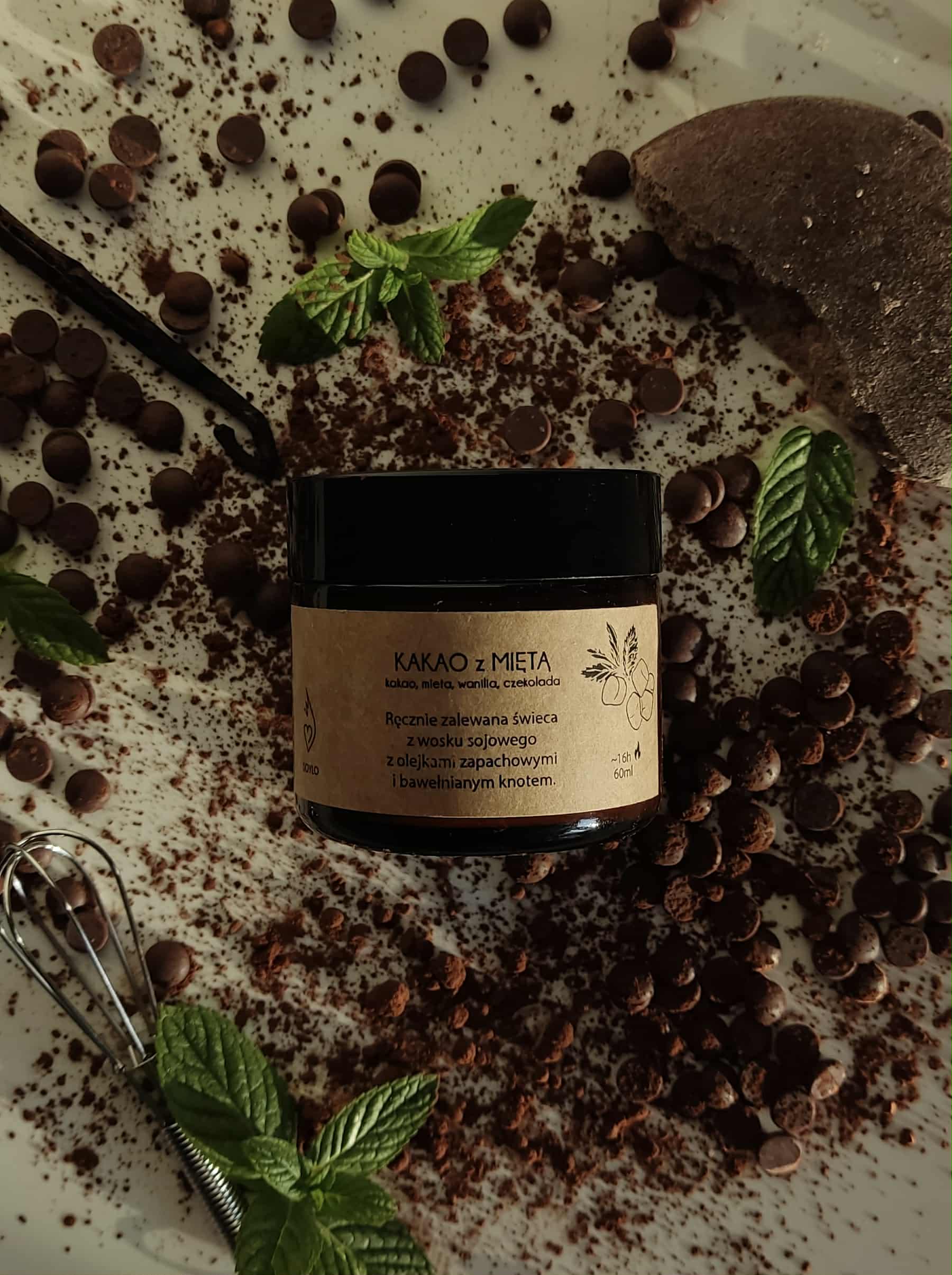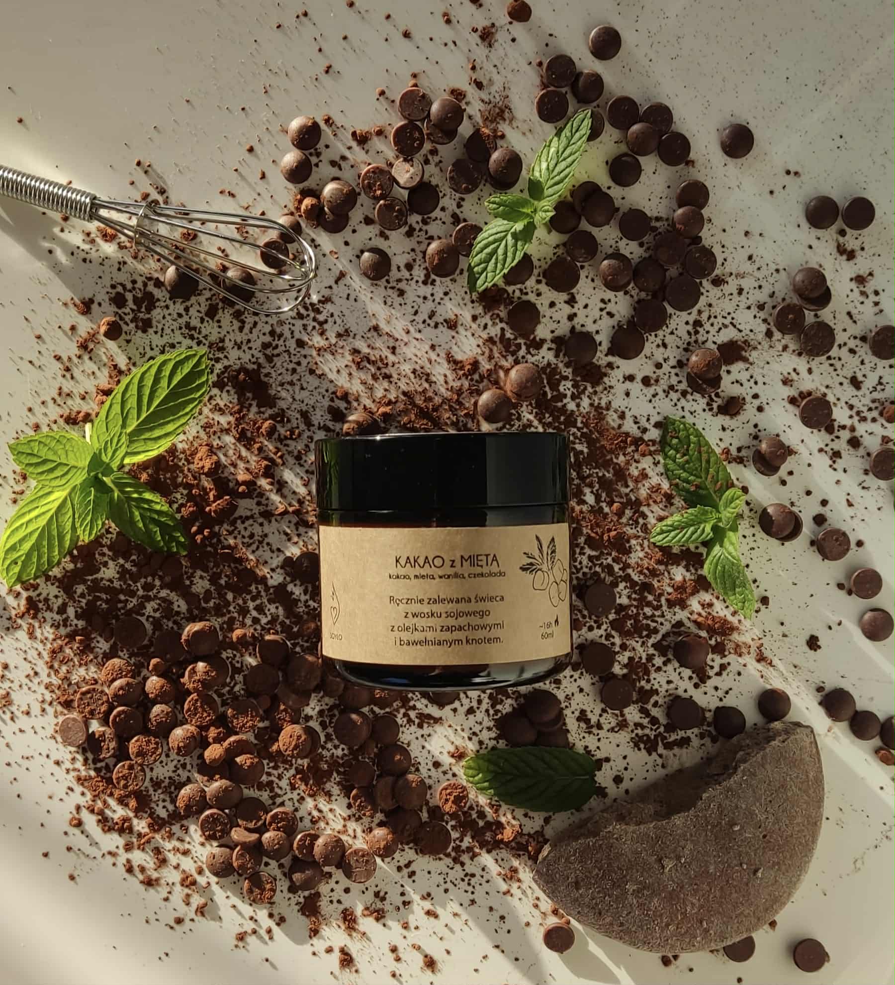 Świeca o zapachu czekolady, kakao, mięty i wanilii.