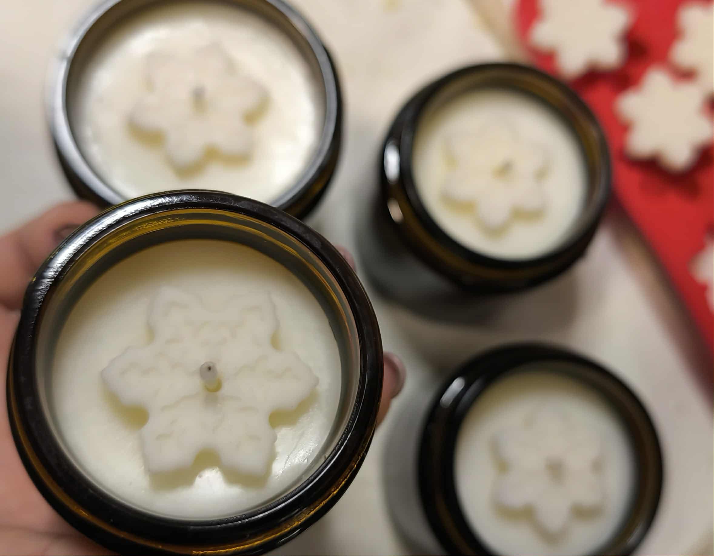 Knot bawełniany, dekorowany płatkiem śniegu z wosku sojowego.