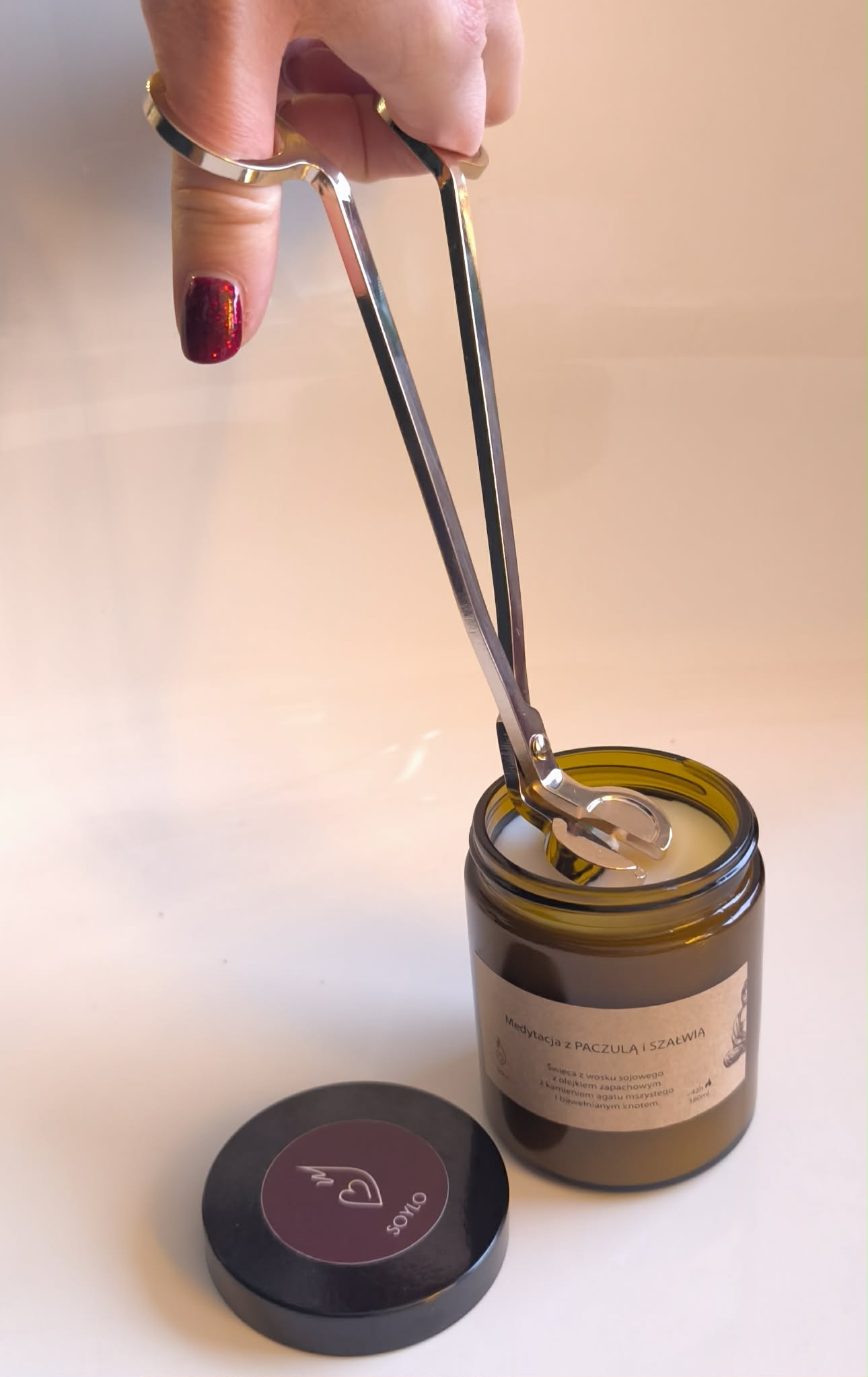 Metalowe nożyce wyprofilowane, pomagają łatwo obciąć knot zarówno bawełniany i drewniany.
