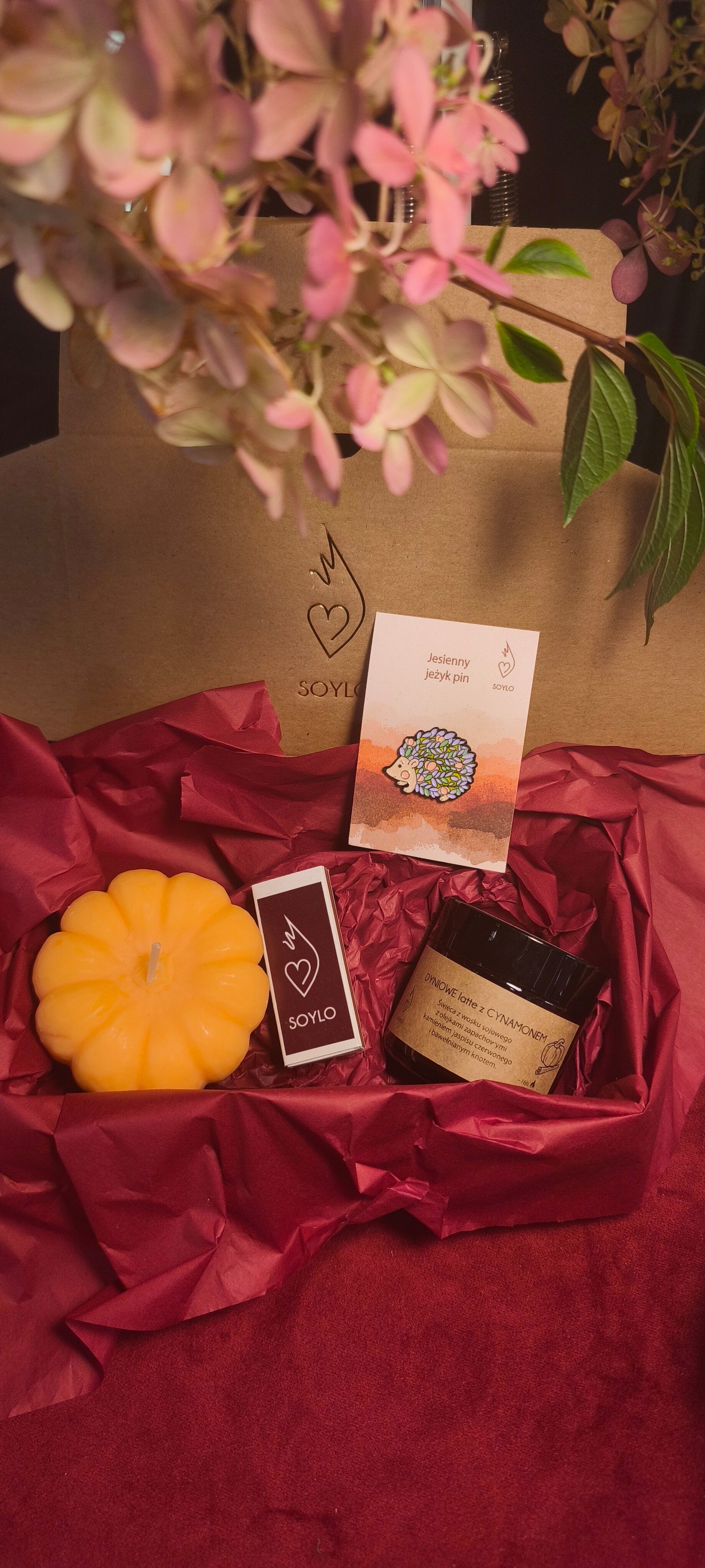 Świeca zapachowa jesienna + świeca ozdobna jesienna + pin jeż